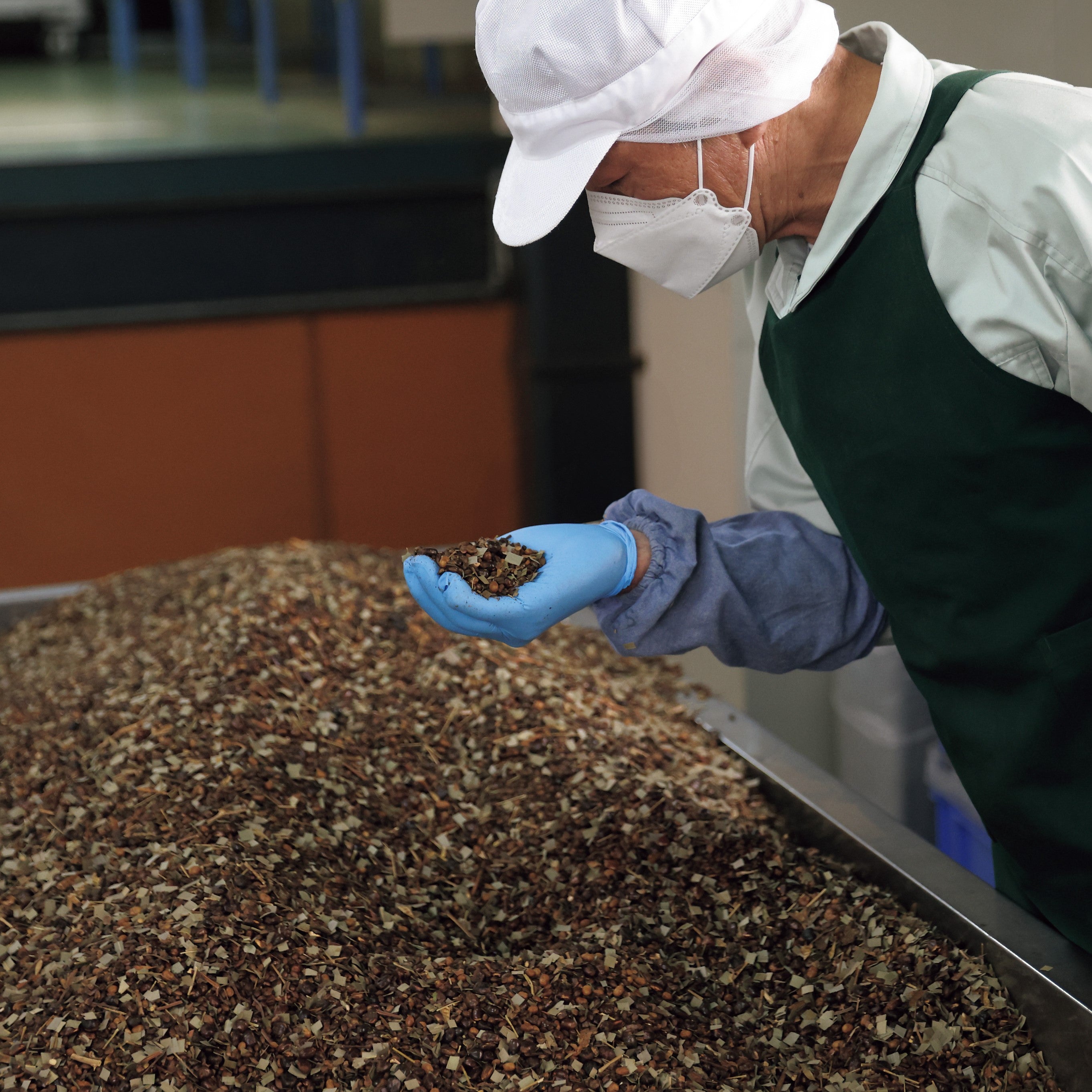 村田園は美味しさと安全へのこだわりから、製造工程全てを自社工場で一貫して管理しています。原料は最適な環境下で保管し、異物等がないか目視と強力マグネットで徹底した除去を行います。味を左右するブレンドでは、特に時間かけ、じっくりと職人の手と専用の機械により混ぜ合わせます。最後に、完成した「万能茶」は社内検査員による試飲検査を課し、おいしさと品質をクリアした商品のみがお客様の元へ届けられます。