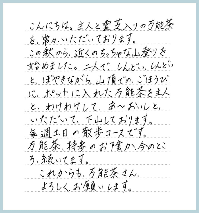 こんにちは。主人と霊芝入りの万能茶を、常々いただいております。この秋から、近くのちっちゃな山登りを始めました。二人で、しんどい、しんどいと、ぼやきながら、山頂での、ごほうびに、ポットに入れた万能茶を主人と、わけわけして、あ~おいしと、いただいて、下山しております。毎週土日の散歩コースです。万能茶持参のお陰か、今のところ続いています。これからも万能茶さん、よろしくお願いします。【Y・S様】