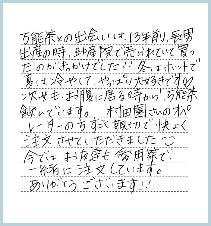 万能茶との出会いは、13年前、長男出産の時、助産院で売られていて買ったのがきっかけでした!!冬はホットで夏は冷やして、やっぱり大好きです。次女もお腹に居る時から、万能茶を飲んでいます。村田園さんのオペレーターの方がすごく親切で、快く注文させていただきました。今ではお友達も愛用茶で、一緒に注文しています。ありがとうございます!!【ことはる様】