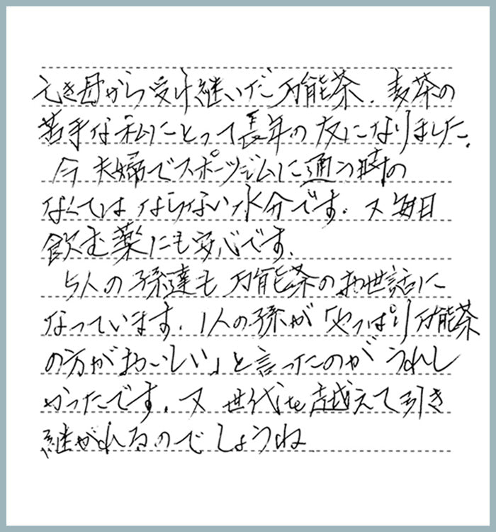 亡き母から受け継いだ万能茶。麦茶の苦手な私にとって長年の友になりました。今、夫婦でスポーツジムに通う時のなくてはならない水分です。又、毎日飲む薬にも安心です。5人の孫達も万能茶のお世話になっています。一人の孫が「やっぱり万能茶の方がおいしい」と言ったのがうれしかったです。又、世代を越えて引き継がれるのでしょうね。【すず子様】
