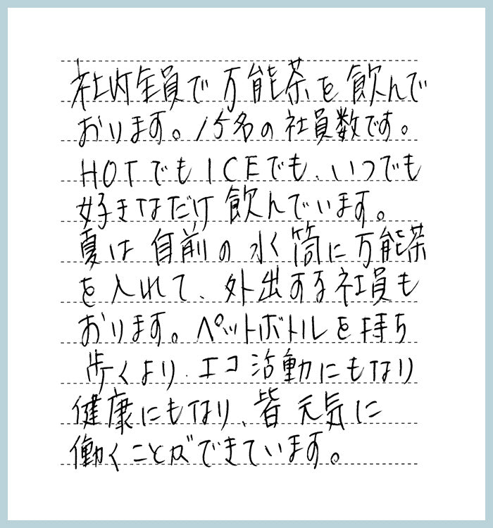 社内全員で万能茶を飲んでおります。15名の社員数です。HOTでもICEでも、いつでも好きなだけ飲んでいます。夏は自前の水筒に万能茶を入れて、外出する社員もおります。ペットボトルを持ち歩くより、エコ活動にもなり健康にもなり、皆元気に働くことができています。【東京 H・Y様】
