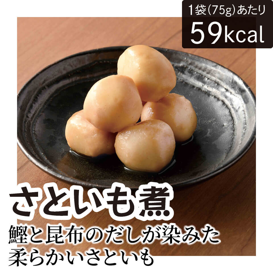 里いも(中国産)、しょうゆ、砂糖、還元水あめ、みりん、昆布エキス、魚介エキス、食塩、酢酸発酵調味料、鰹節粉末、酵母エキス、(一部に小麦・大豆を含む)