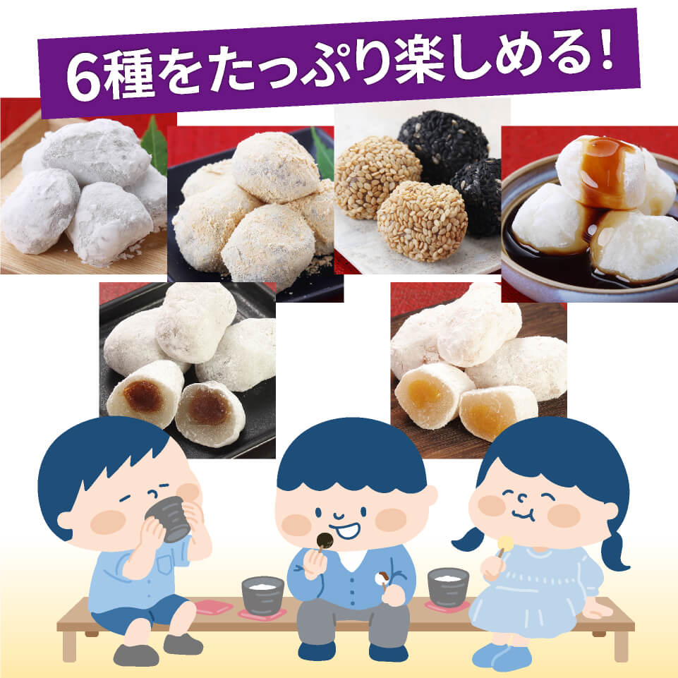 商品規格大福もち、きなこ餅、 ごま団子、黒みつ餅、栗大福、芋大福、各2個 賞味期限 保存方法 注意事項 原材料 エネルギー: たんぱく質: 脂質: 炭水化物: ナトリウム: 遺伝子組替 アレルゲン