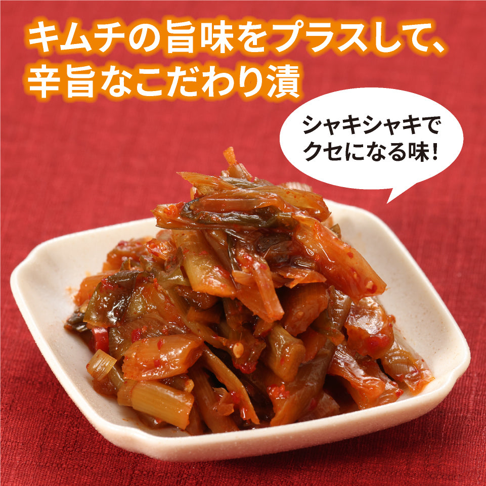 にら(国産)、漬け原材料[醤油、砂糖・ぶどう糖果糖液糖、唐辛子、還元水飴、醸造酢、発酵調味液、リンゴ、にんにく、食塩、たん白加水分解物、生姜、ごま、トマト、玉葱]/調味料(アミノ酸等)、酸味料、香料、カラメル色素、酸化防止剤(ビタミンC)、増粘多糖類、(一部に小麦を含む)