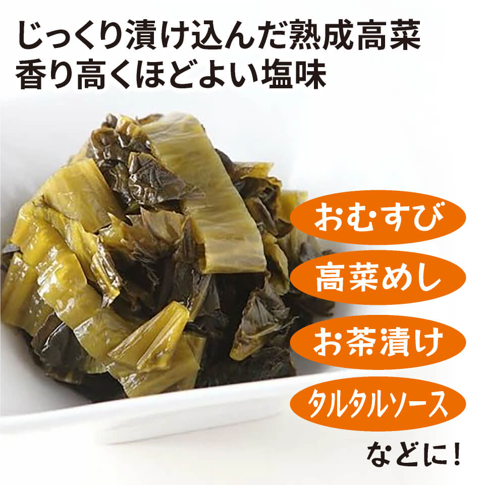 高菜、漬け原材料[醤油、食塩、かつお節エキス]/調味料(アミノ酸等)、酸味料、着色料(うこん)、(一部に小麦・大豆を含む)