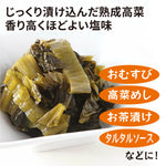 高菜、漬け原材料[醤油、食塩、かつお節エキス]/調味料(アミノ酸等)、酸味料、着色料(うこん)、(一部に小麦・大豆を含む)