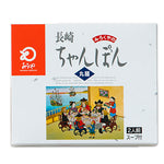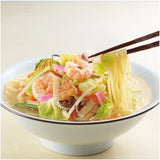 めん[小麦粉(国内製造)、還元水飴、発酵調味料、食酢、食塩/かんすい、クチナシ色素]スープ[食塩、ポークパウダー、ブドウ糖、脱脂粉乳、貝エキス、香辛料/調味料(アミノ酸等)、着色料(カラメル)]調味油[調整ラード、食用植物油脂/酸化防止剤(ビタミンE)](一部に小麦・乳成分・大豆・豚肉・ごまを含む)