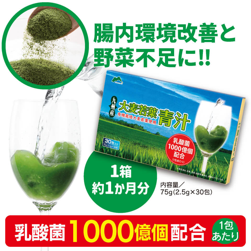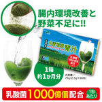 大麦若葉粉末(大麦若葉≪九州産≫)、難消化性デキストリン、野草発酵エキス末(デキストリン、糖蜜、黒砂糖、オリゴ糖、ヨモギ、その他)、抹茶、乳酸菌末(殺菌)、(一部に乳成分・りんごを含む)