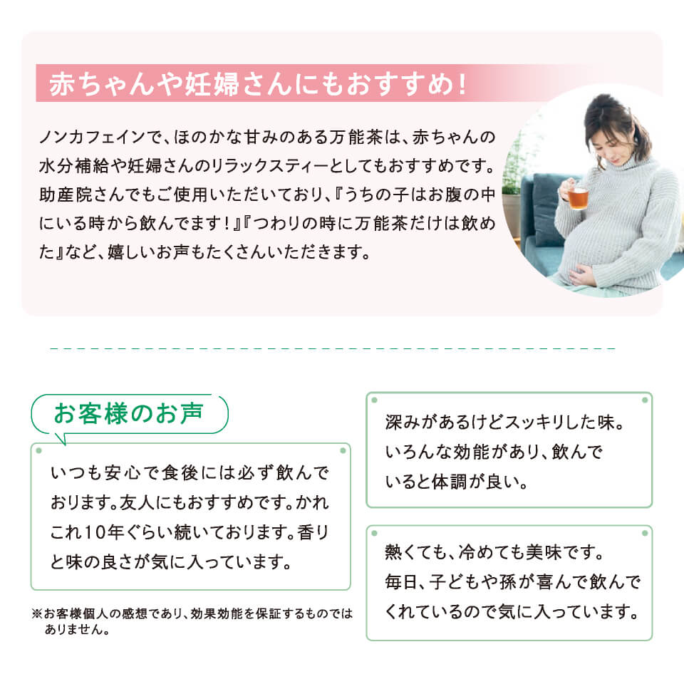 焙煎大麦(国内製造)、焙煎とうもろこし(中国製造)、焙煎はぶ茶(国内製造)、焙煎大豆(国内製造)、焙煎押し麦(国内製造)、焙煎はと麦(国内製造)、焙煎玄米(国内製造)、くま笹、どくだみ、浜茶、ウーロン茎、柿の葉、桑の葉、グァバ、プーアル、甘草、びわの葉、蓮の葉、杜仲葉、大麦若葉、(一部に大豆を含む)