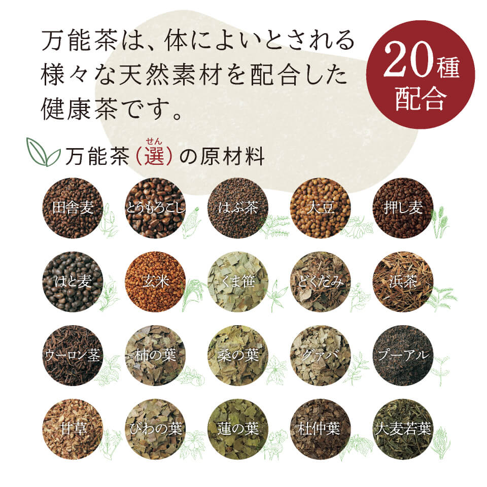 焙煎大麦(国内製造)、焙煎とうもろこし(中国製造)、焙煎はぶ茶(国内製造)、焙煎大豆(国内製造)、焙煎押し麦(国内製造)、焙煎はと麦(国内製造)、焙煎玄米(国内製造)、くま笹、どくだみ、浜茶、ウーロン茎、柿の葉、桑の葉、グァバ、プーアル、甘草、びわの葉、蓮の葉、杜仲葉、大麦若葉、(一部に大豆を含む)