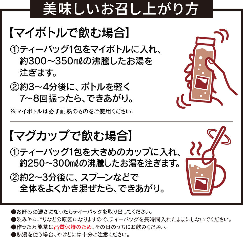 お出かけにぴったりのカップ・マイボトル用万能茶。少し飲みたい時でもカップで美味しく作れます。