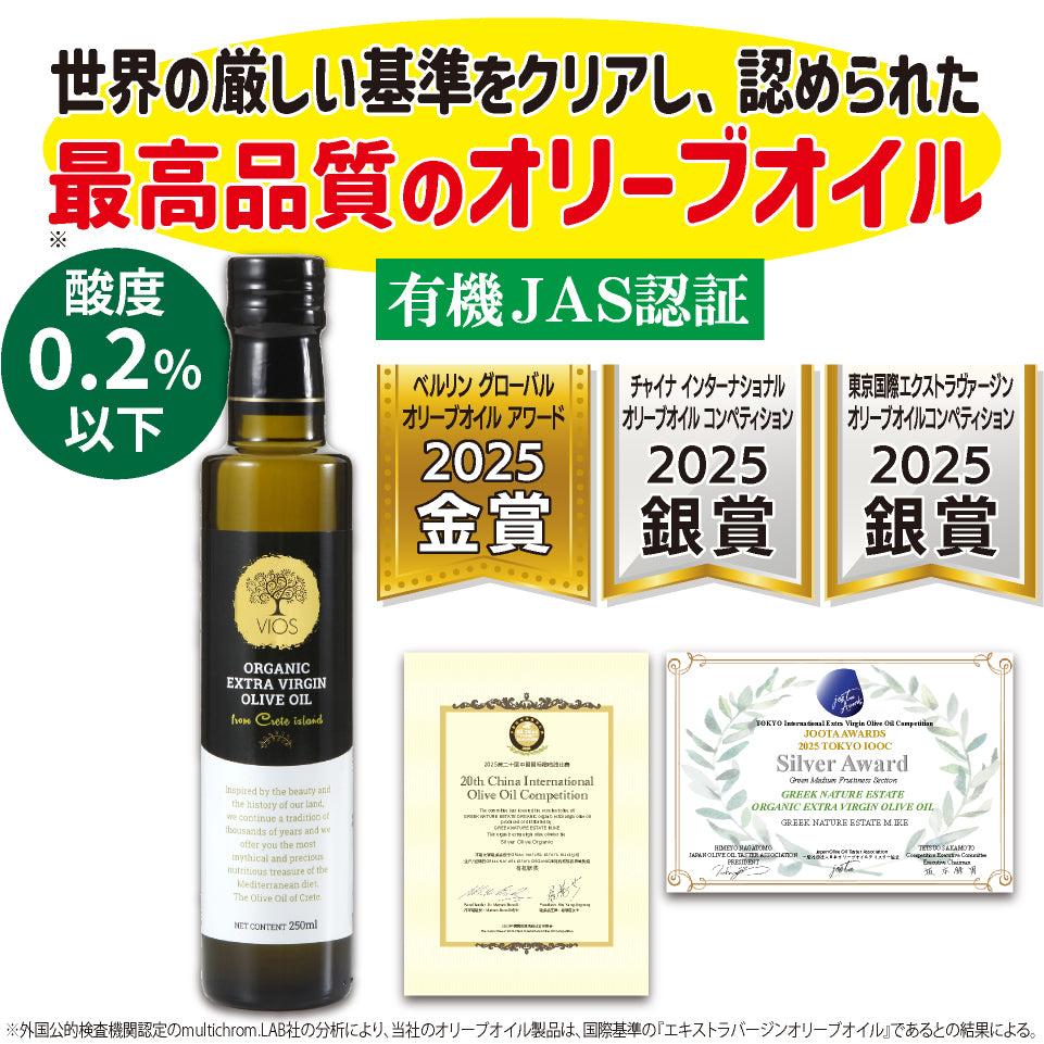 オリーブオイルの中でも、酸度が0.8%以下のものだけをエキストラバージンオイルと呼びます(国際オリーブ連盟基準)。お届けする「エキストラバージンオリーブオイル」は、なんと酸度0.2%以下の希少な最高品質のエキストラバージンオリーブオイルです。