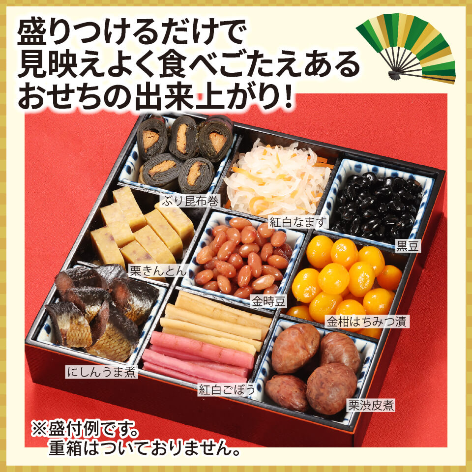 国産丹波黒黒豆、北海道産金時豆、ぶりの昆布巻、金柑蜂蜜漬け、紅白なます、紅白ごぼう、にしんうま煮、栗渋皮煮、栗きんとん、 各1袋