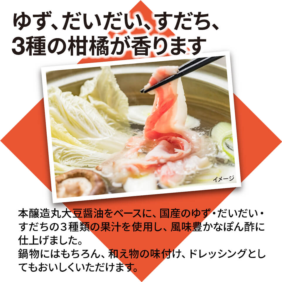 しょうゆ、(小麦・大豆を含む)(国内製造)、醸造酢、砂糖、柑橘果汁(ゆず、だいだい、すだち)、みりん、魚貝エキス、こんぶエキス、酵母エキス、かつおエキス
