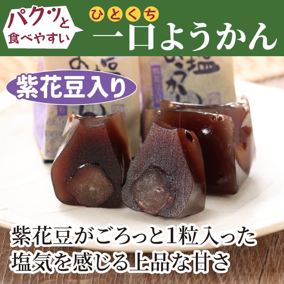 山奥から湧き出るミネラル豊富な塩水を用いて製塩された「山塩」をアクセントにゴロっと大きな蜜漬けされた「紫花豆」を1つ入れた食べ応えのある一口羊羹です。
